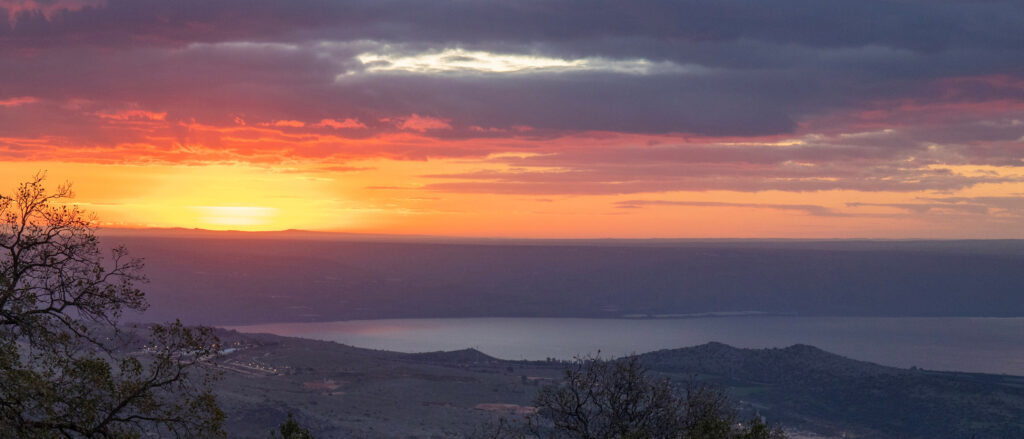 זריחה מהרי הגולן כפי שהיא נשקפת מהרי הגליל . כל בוקר ישנה הבטחה חדשה. מי ים הכנרת מקבלים את שובל הצבעים הממתיקים ומעירים את החושך.